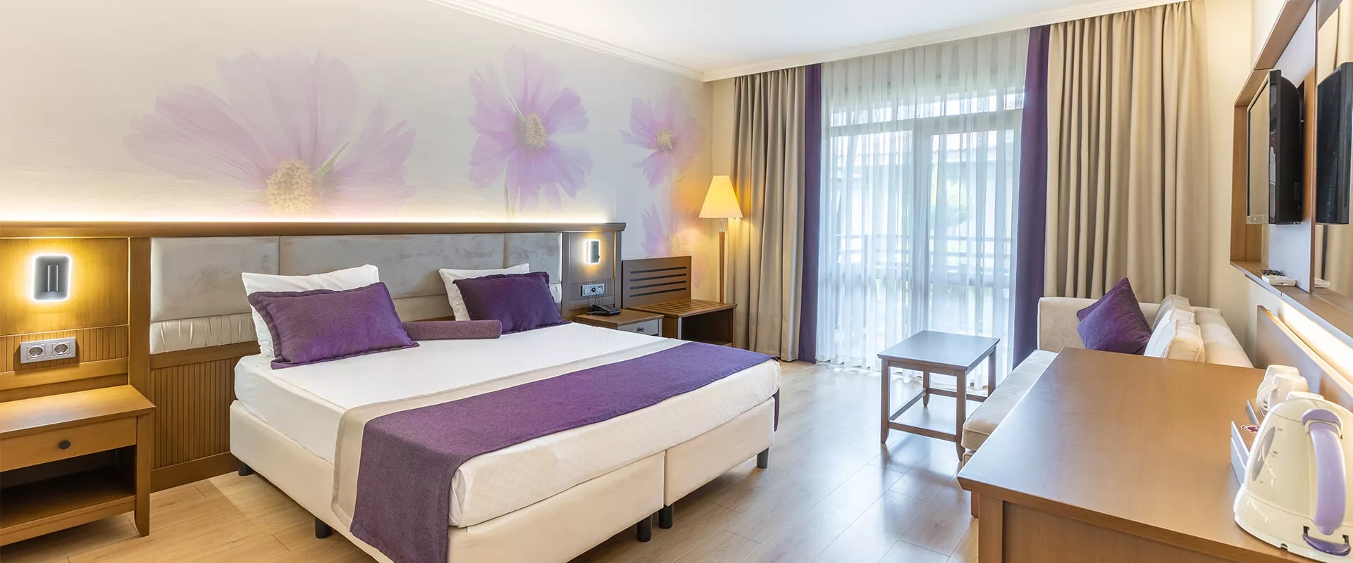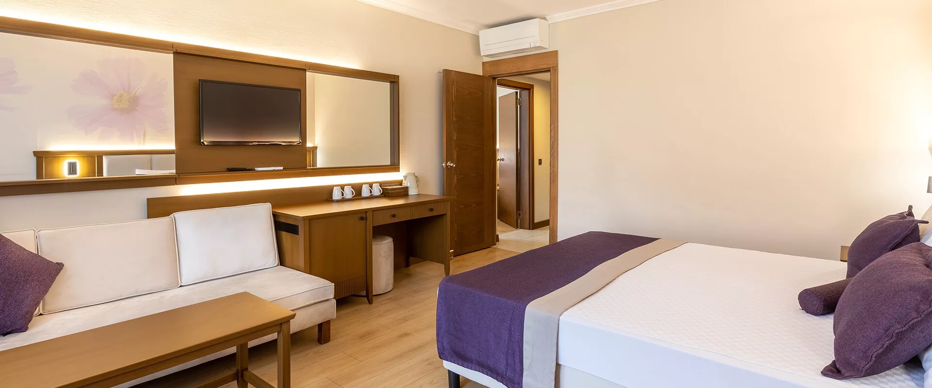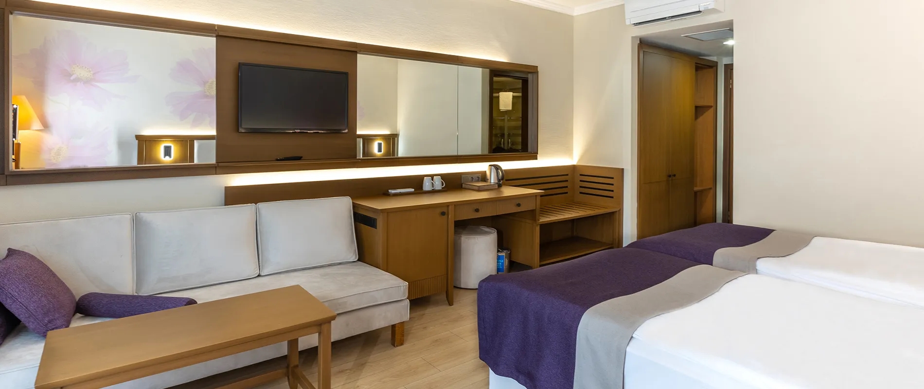 Büyük aile odaları 40 m² büyüklüğünde. Ara kapılı odalarda çift kişilik tek yatak ve tek kişilik iki ayrı yatak ile açılır kapanır kanepe bulunuyor.